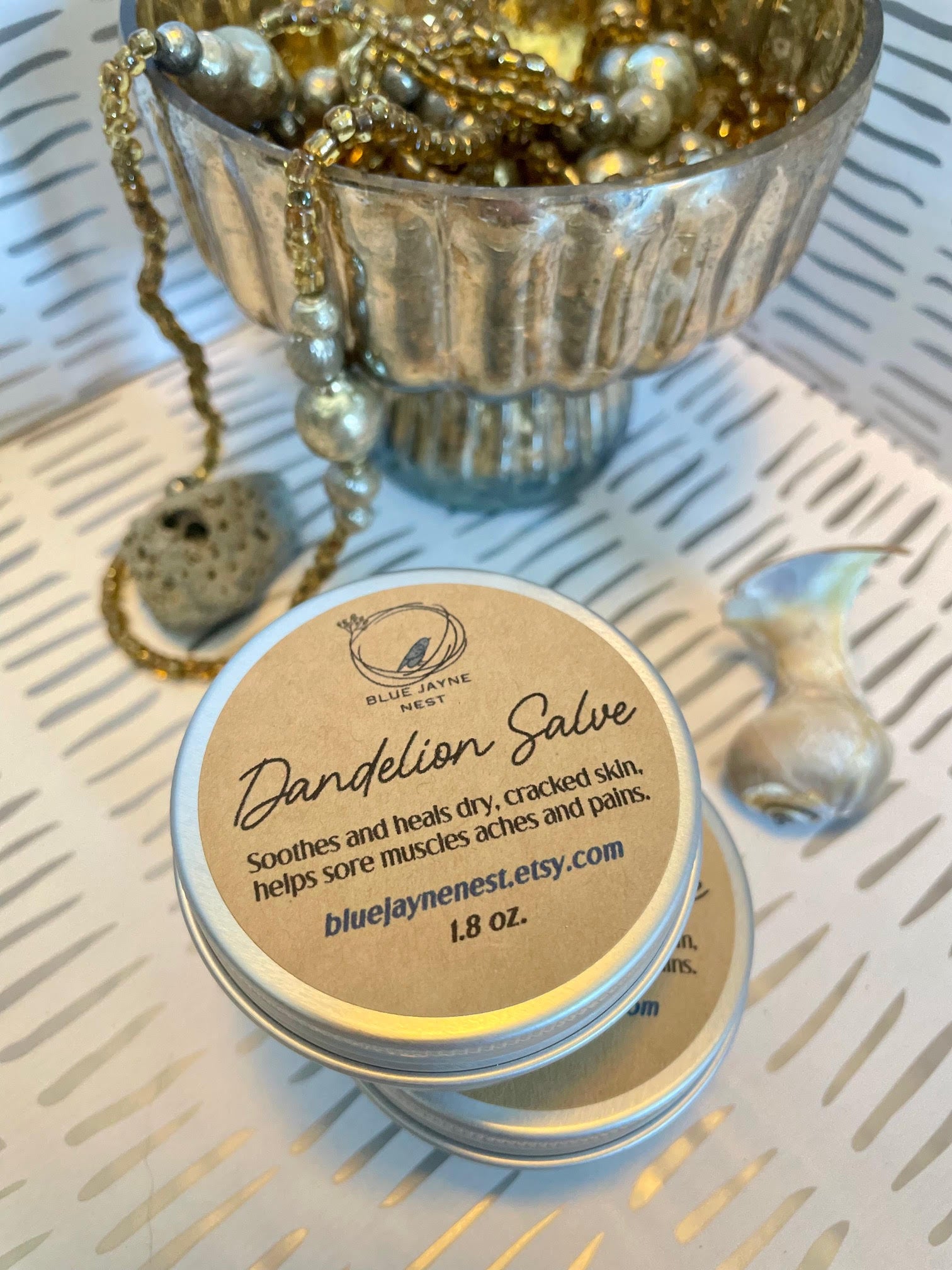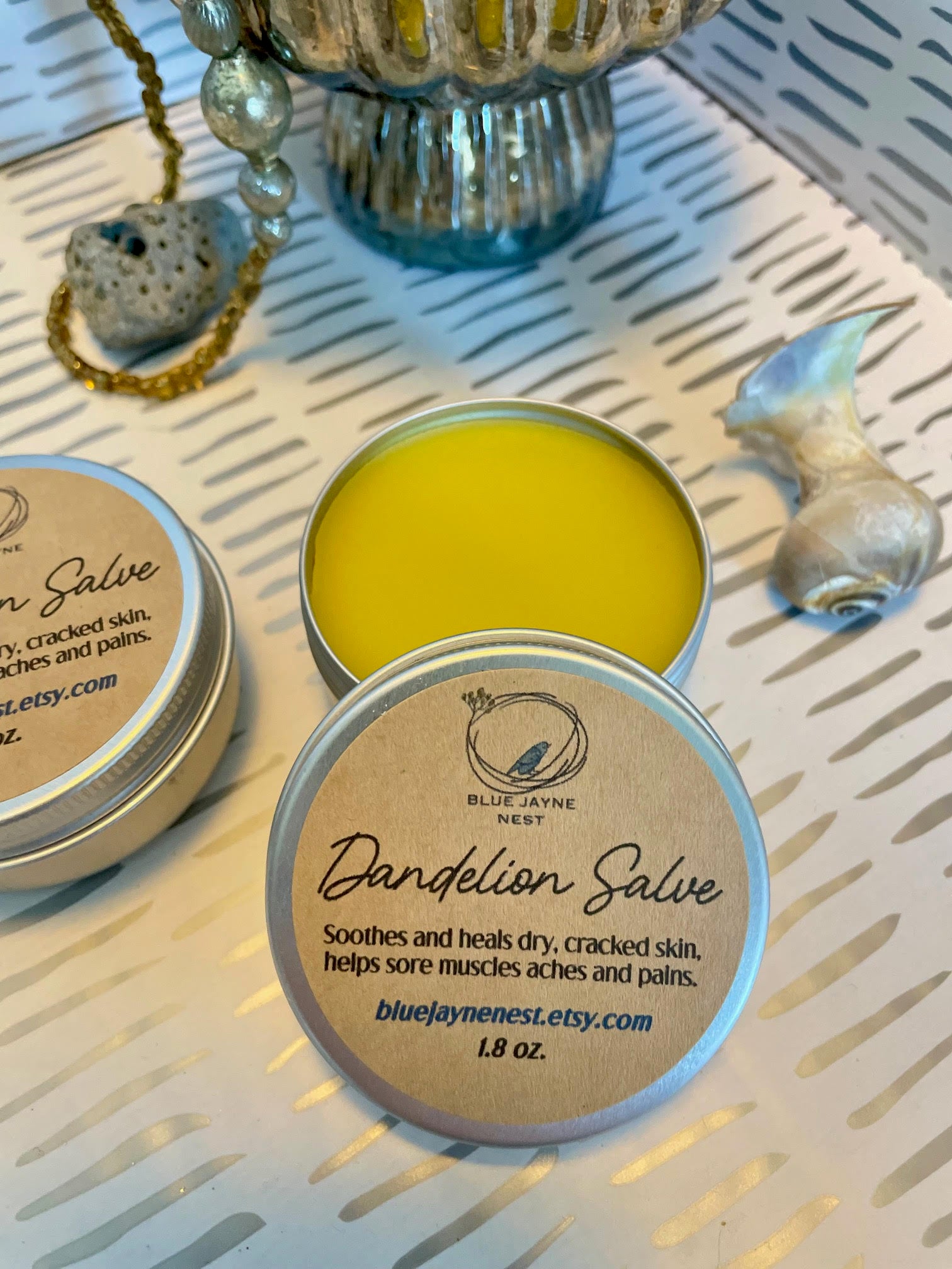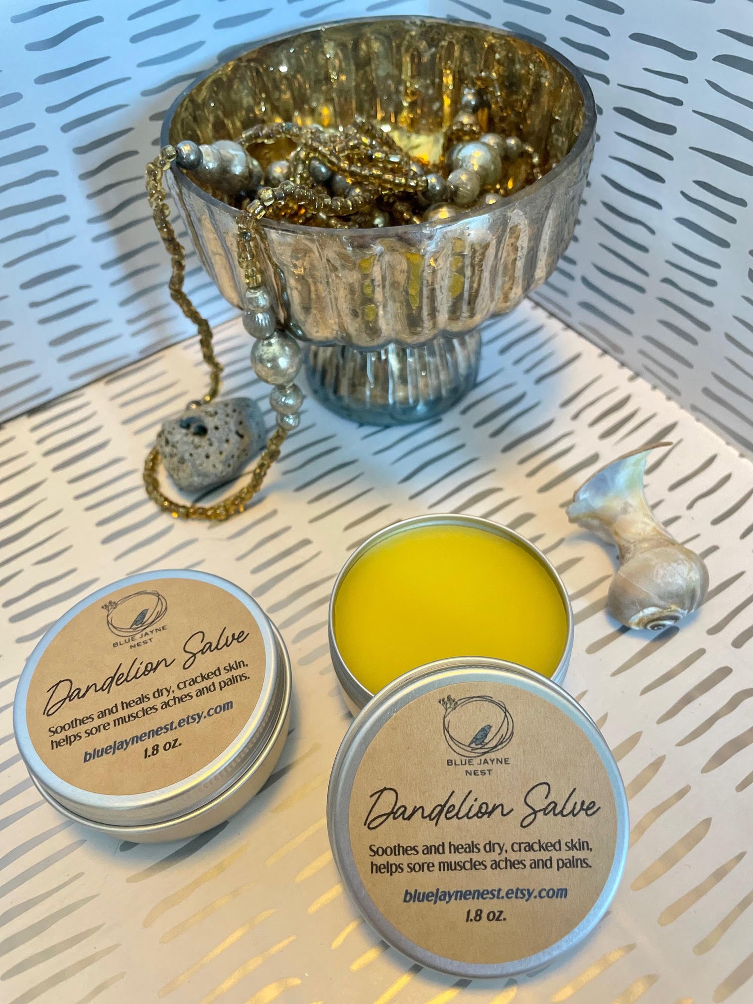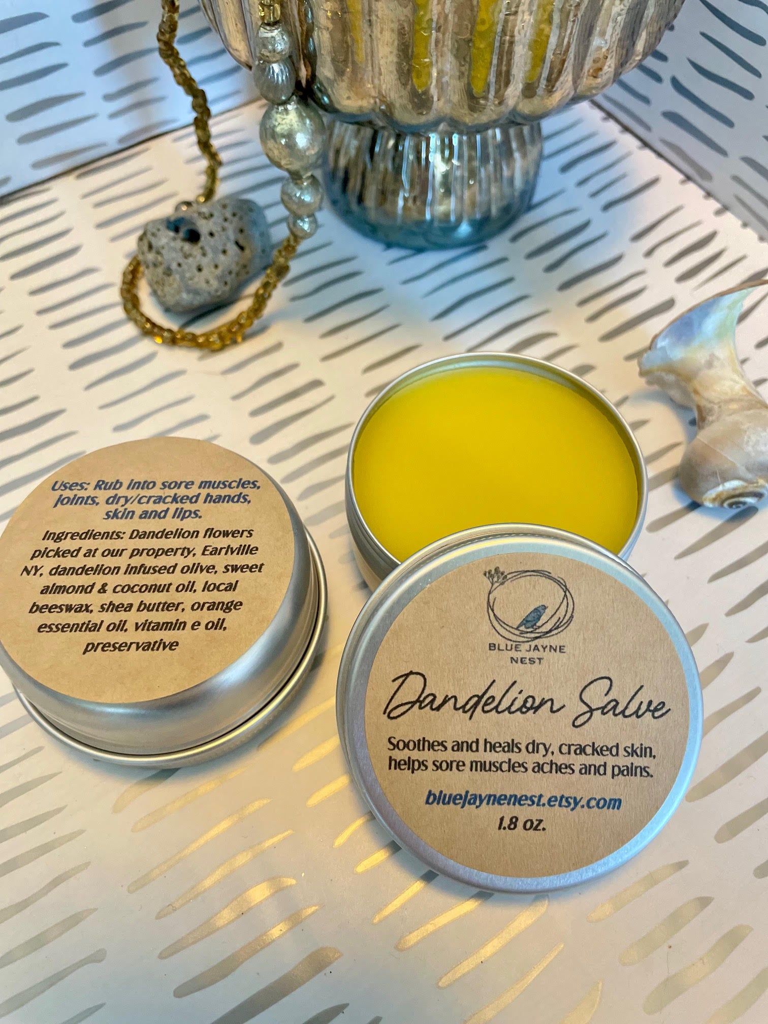 Patch test is recommended first to make sure you are not sensitive to the ingredients. Hand poured into a 1.7 oz reusable tin with a screw top lid. Weighs approximately 1.5 oz. The color is bright yellow from the flower petals. So pretty!