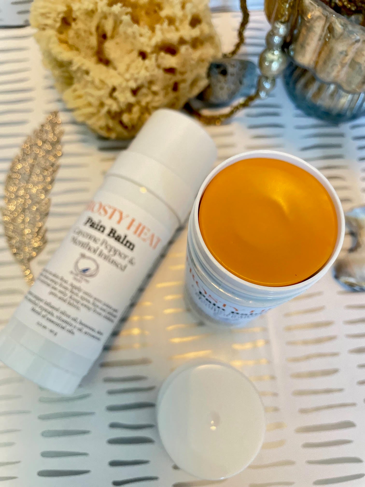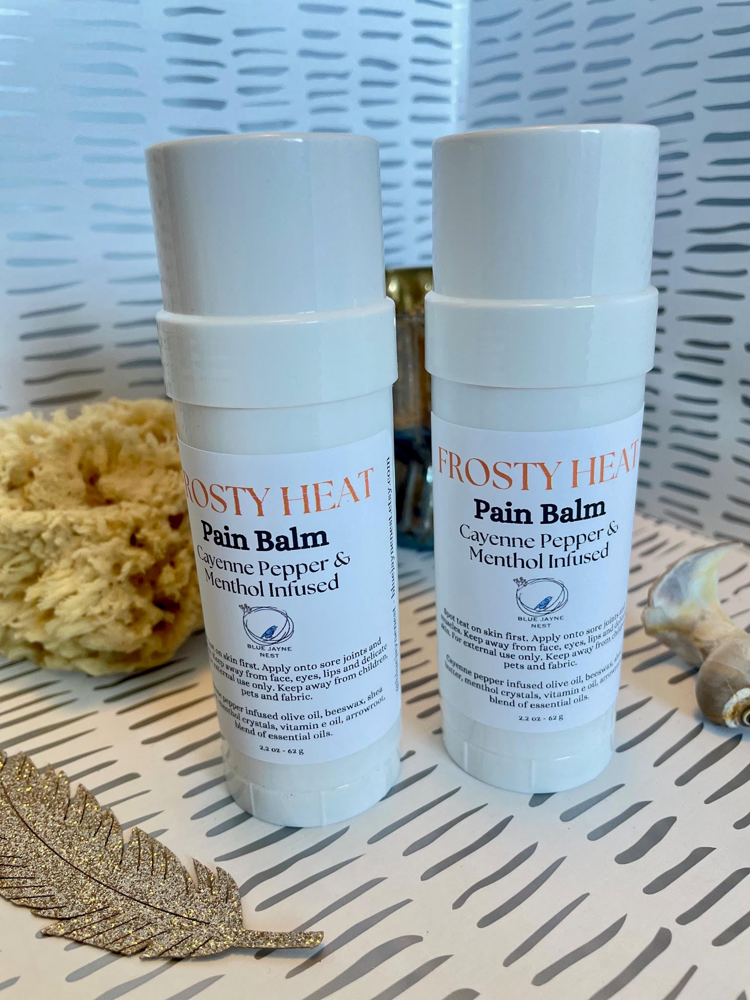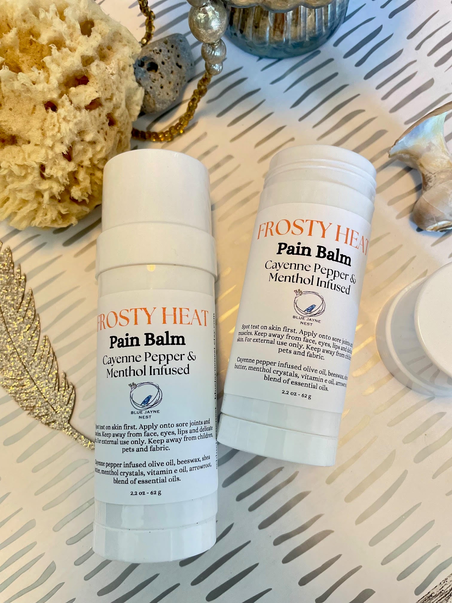 Enjoy this soothing "Frosty Heat'" Pain Balm made with cayenne infused olive oil, beeswax and menthol crystals, finished with a blend of essential oils. Easy to apply in this ample sized 2.2 oz. twist up stick with screw on lid. Easy and clean. Enough beeswax is used to make this balm solid and will not be gummy, sticky or wet - it's the perfect consistency to apply and rub into skin.