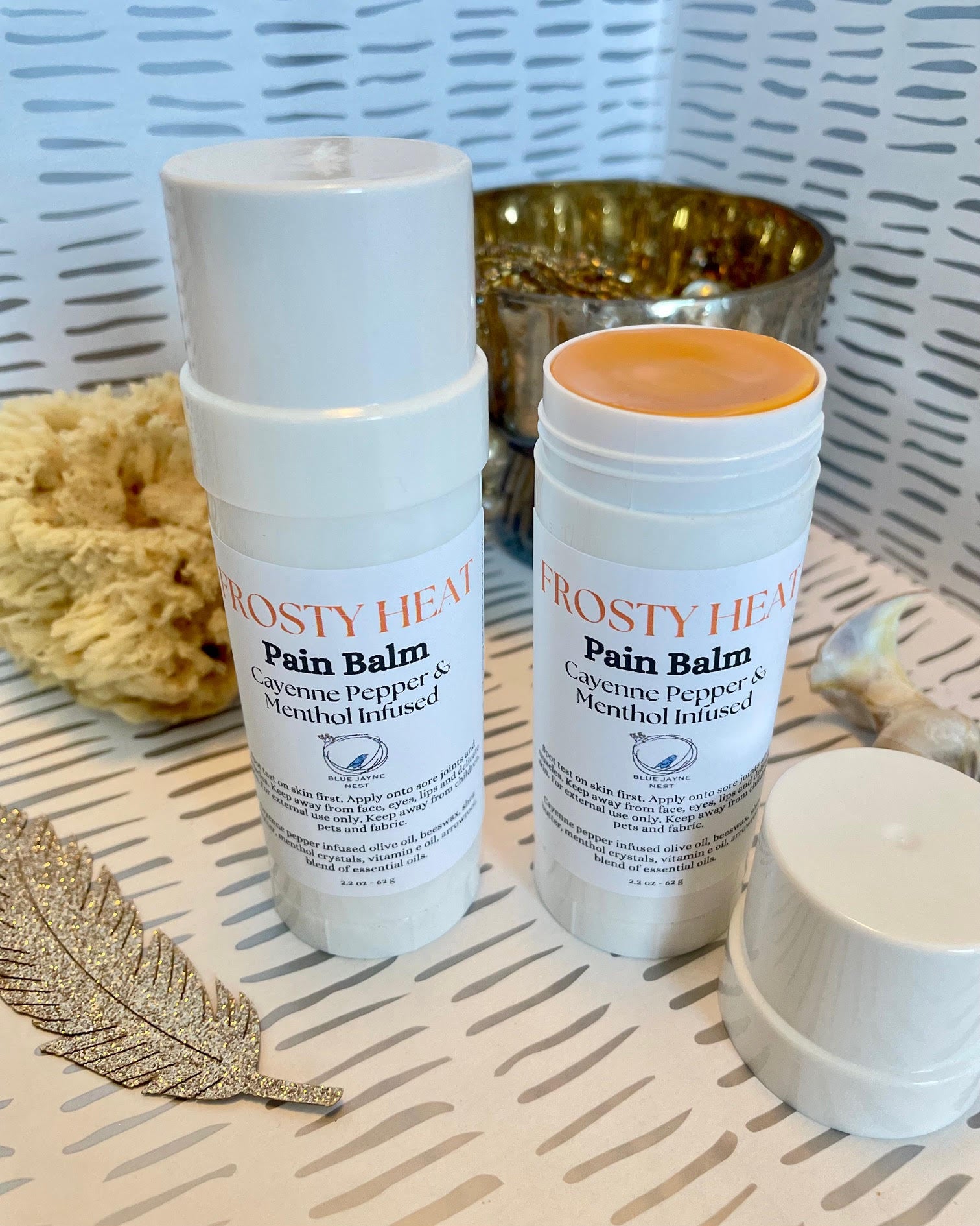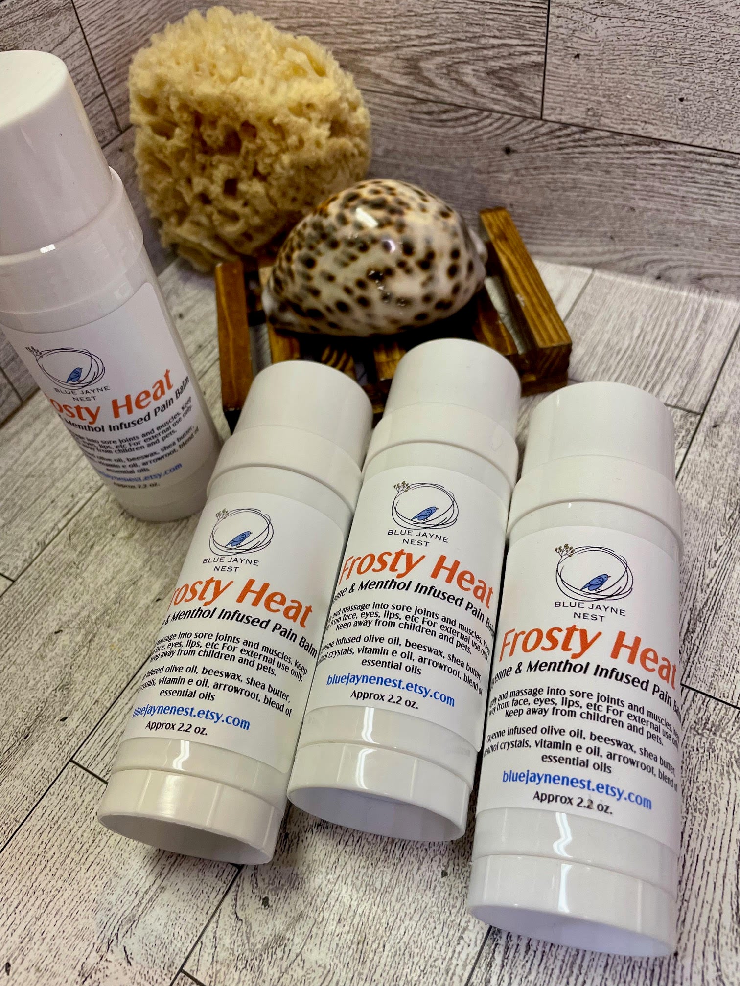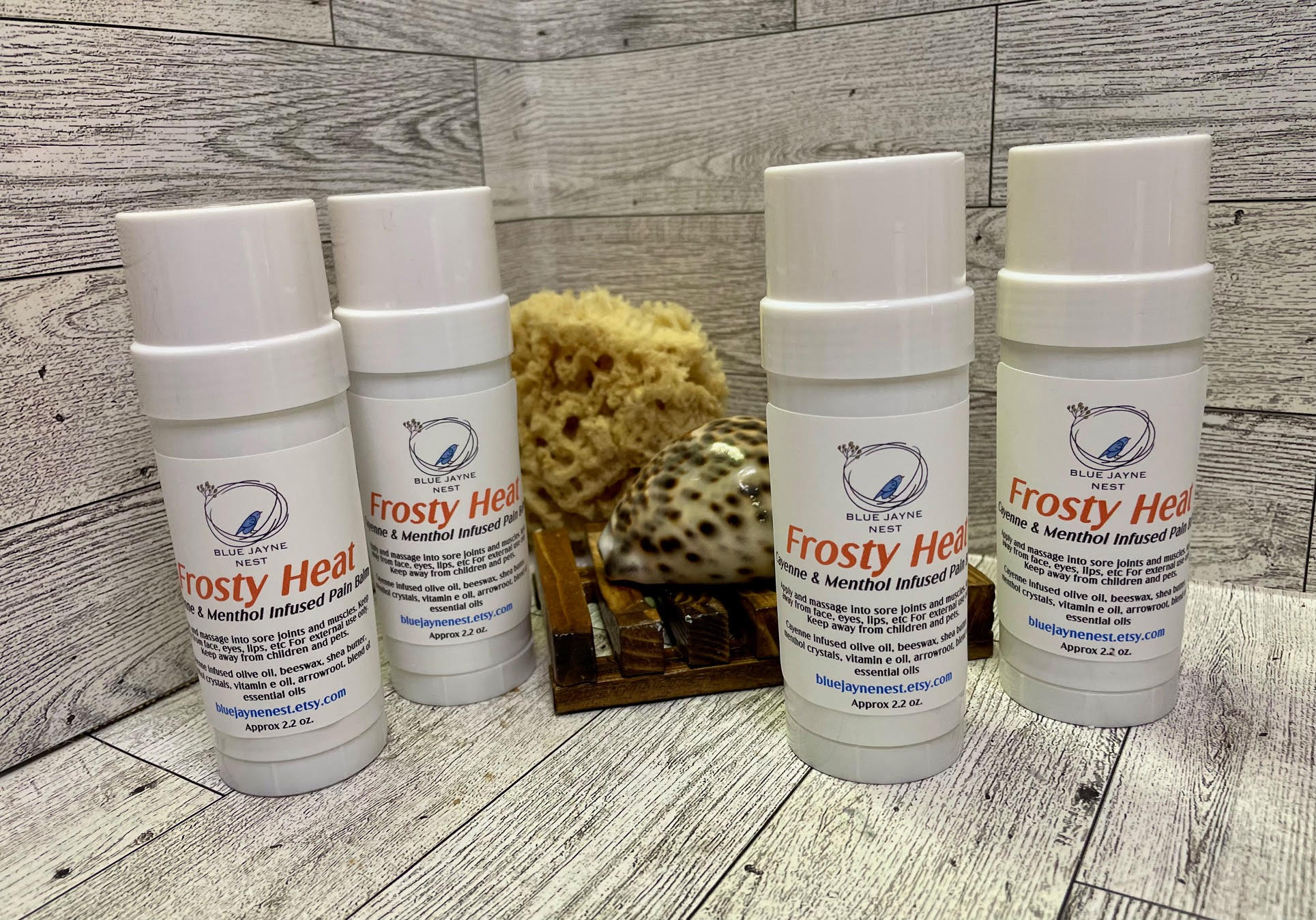 Enjoy this soothing "Frosty Heat'" Pain Balm made with cayenne infused olive oil, beeswax and menthol crystals, finished with a blend of essential oils. Easy to apply in this ample sized 2.2 oz. twist up stick with screw on lid. Easy and clean. Enough beeswax is used to make this balm solid and will not be gummy, sticky or wet - it's the perfect consistency to apply and rub into skin.