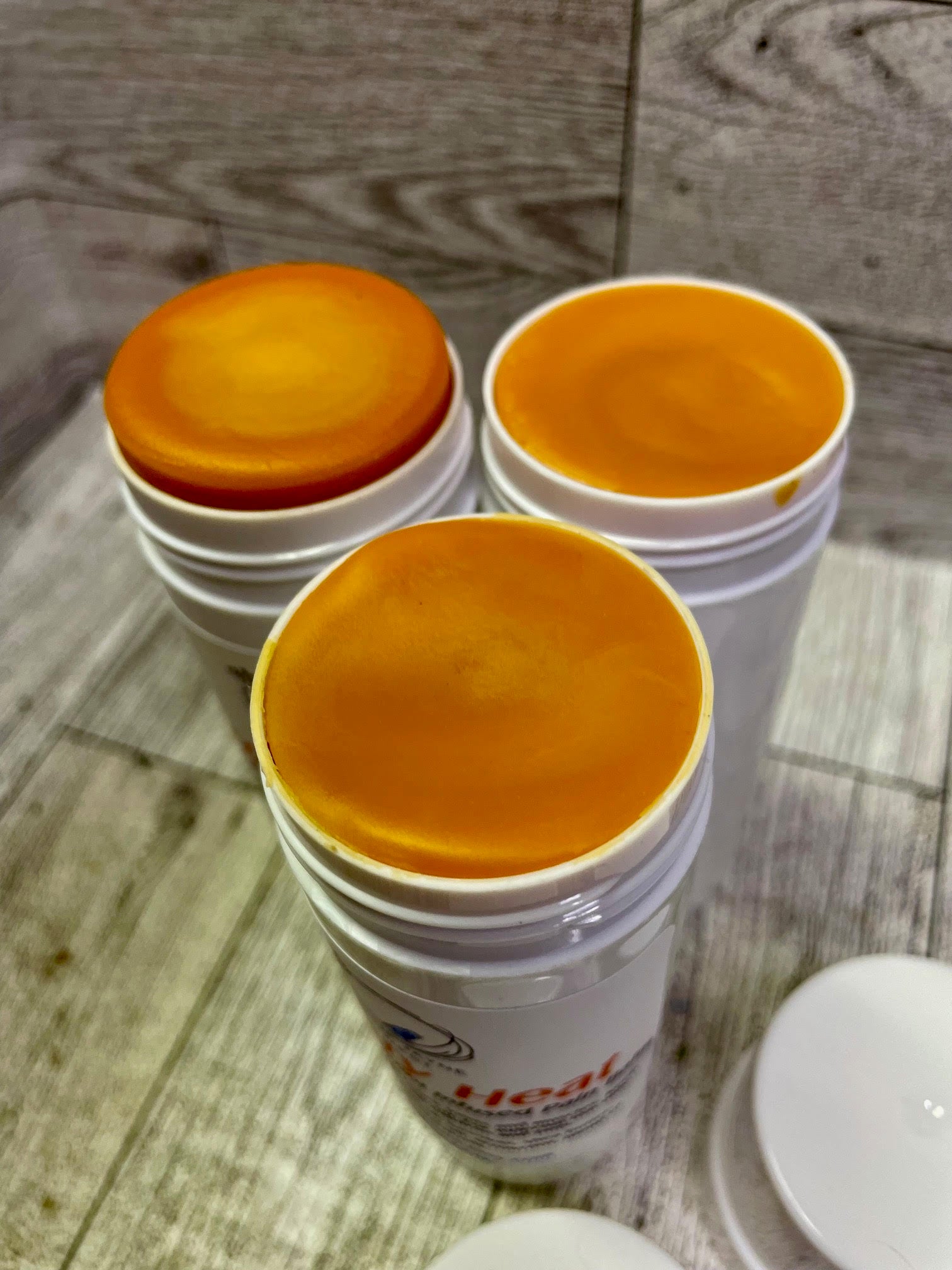 Ingredients: olive oil, cayenne pepper, beeswax, shea butter, menthol crystals, arrowroot, vitamin e oil, blend of essential oils (wintermint, orange, camphor, clove, spearmint)